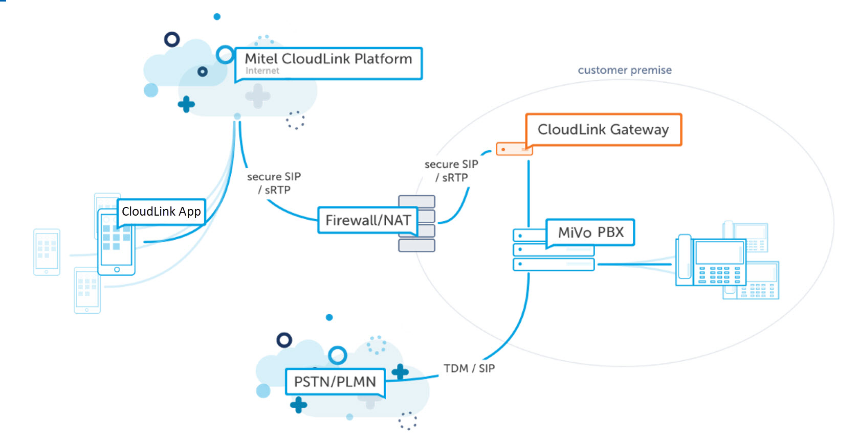 Mitel CloudLink è una piattaforma che consente la comunicazione tra i PBX in sede (ad esempio MIVoice Office 400) e le applicazioni basate sul cloud, come Mitel One e Mitel MiVoice Office.