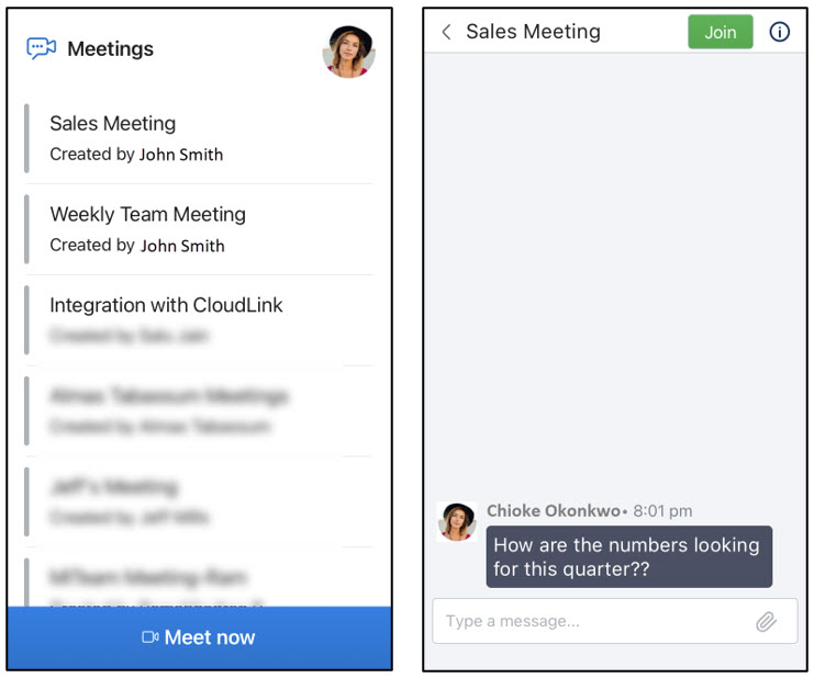 - clicar na reunião a partir do ecrã Meetings da aplicação móvel MiTeam Meetings e, de seguida, clicar em Participar no ecrã de chat que aparece