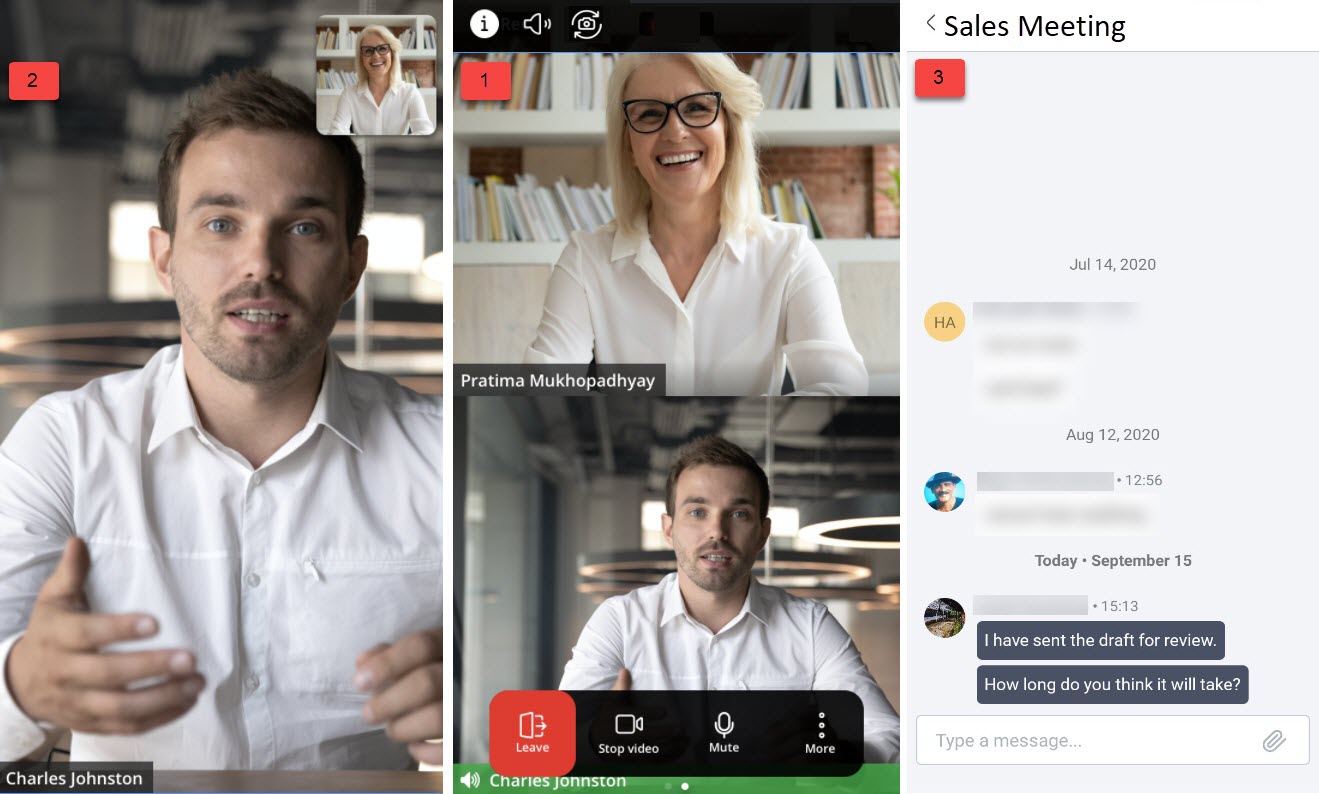 Apenas será apresentada uma vista de cada vez. Por predefinição, a reunião abre-se na vista do ecrã principal. No ecrã principal, deslize com o dedo para a direita para mudar para a vista da pessoa que está a falar ou deslize com o dedo para a esquerda para mudar para a vista do ecrã de chat.