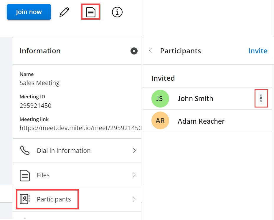 Note: Die anderen Teilnehmer können die Einladung des Meeting-Erstellers nicht abbrechen. - Klicken Sie auf das Symbol für Meeting-Informationen (