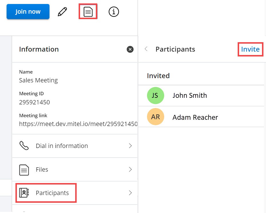 Registrierte Benutzer, die zum Meeting eingeladen wurden, werden direkt zum Meeting zugelassen. Ein registrierter Benutzer gilt nur dann als eingeladen, wenn der Meeting-Ersteller ihn durch einer der folgenden Aktionen zum Meeting einlädt: