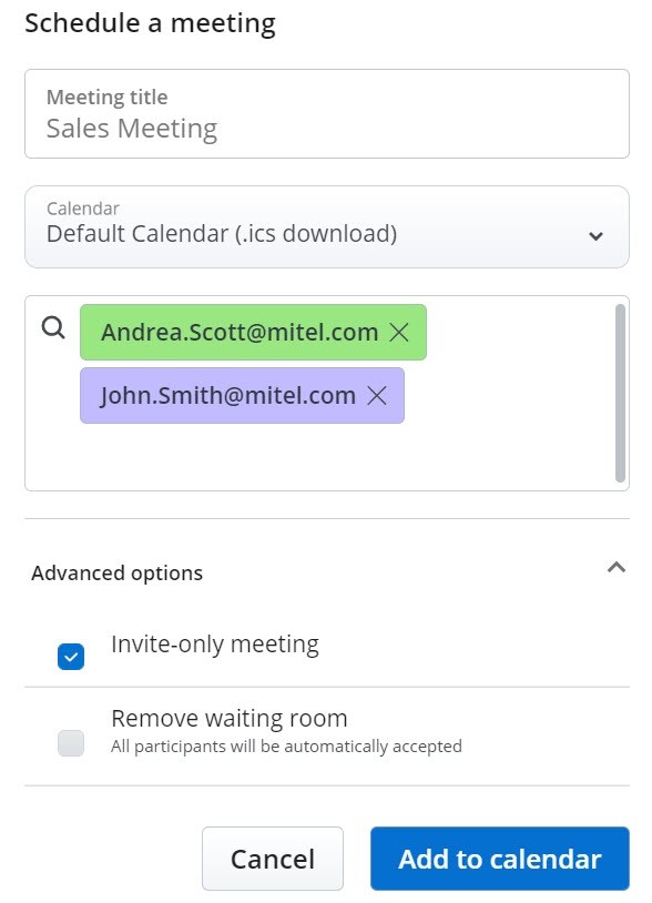 Um ein Meeting nur mit Einladung zu planen, führen Sie die Schritte 1 bis 5 entsprechend der Anleitung Ein geplantes Meeting erstellen aus. Bevor Sie Schritt 5 ausführen, klicken Sie auf Erweiterte Optionen, und aktivieren Sie das Kontrollkästchen Meeting nur mit Einladung.