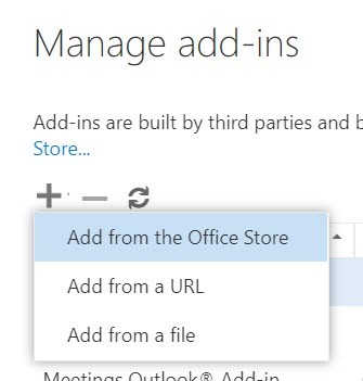 - Klicken Sie im sich öffnenden Bedienfeld Add-Ins verwalten auf das +-Zeichen und wählen Sie in der angezeigten Dropdownliste Aus dem Office Store hinzufügen. Sie können auch auf die URL Weitere Add-Ins von Outlook im Office Store finden klicken, um auf den Office Store zuzugreifen.