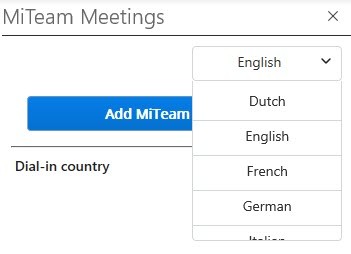 Note: Sie können die im Aufgabenbereich MiTeam Meetings eingestellte Standardsprache ändern, indem Sie auf die Sprachauswahloption klicken und eine beliebige Sprache aus der Dropdown-Liste auswählen.