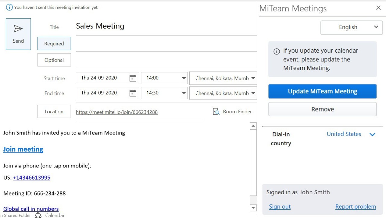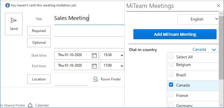 - Klicken Sie auf MiTeam Meeting hinzufügen. Ein Meeting wird erstellt und erscheint in der Liste Meine Meetings Ihrer MiTeam-Meetings-Anwendung. Das Meeting erscheint auch in der Liste "Meine Meetings" der eingeladenen Personen. Die Kalendereinladung in Outlook wird automatisch mit der Option Jetzt beitreten, der Einwahlnummer und dem Link zu den Globalen Einwahlnummern aufgefüllt. Die URL des Meetings wird in das Feld Ort eingegeben.