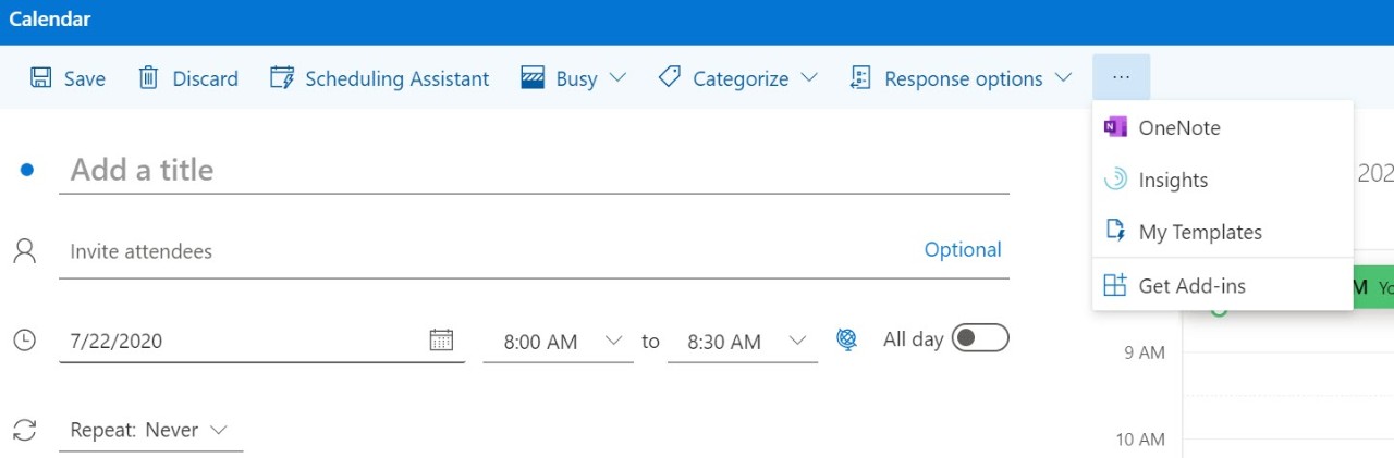 - Öffnen Sie Ihren Outlook-Kalender und erstellen Sie ein neues Meeting. Ein Fenster wird geöffnet, in das Sie die erforderlichen Informationen für das Meeting eingeben müssen.