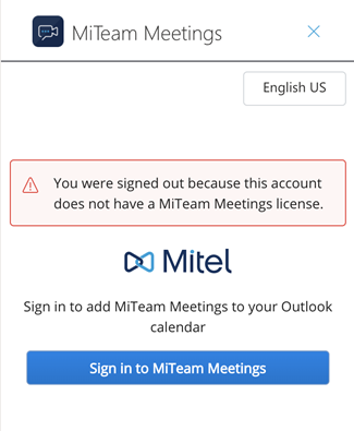 - Melden Sie sich bei Ihrem MiTeam Meetings-Konto an, indem Sie auf Bei MiTeam Meetings anmelden klicken. Die Anmeldeseite für Mitel-Konten wird in einem neuen Fenster geöffnet.Note: Wenn Sie die Outlook Web-Anwendung verwenden, werden Sie aufgefordert, die Anzeige eines neuen Fensters zuzulassen, wenn Sie auf Bei MiTeam Meetings anmelden klicken. Klicken Sie auf Zulassen.