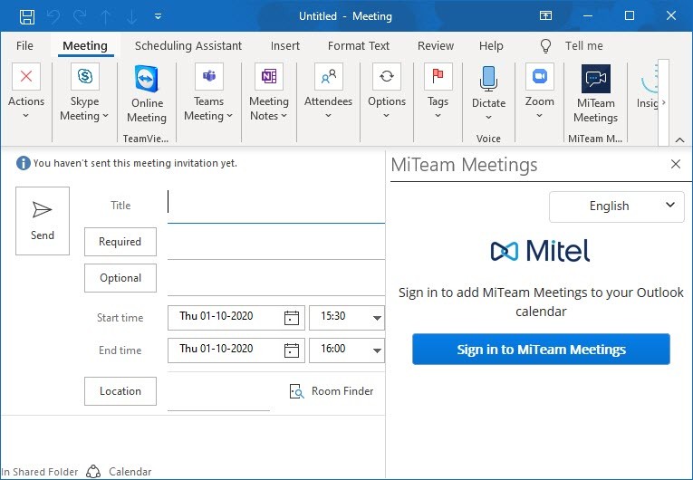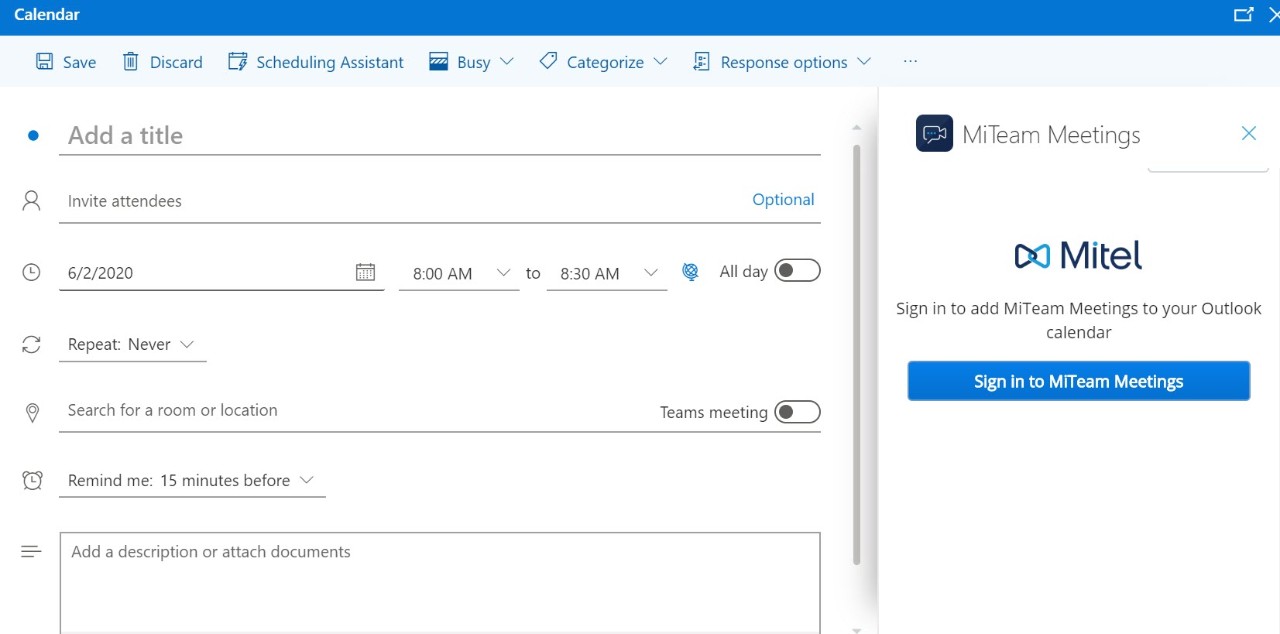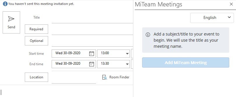 Mit dem Add-In MiTeam Meetings können Sie ein MiTeam-Meeting von Ihrer Outlook-Anwendung aus planen. Mit dem Add-In können Sie ein MiTeam-Meeting zu jeder neuen oder bestehenden Veranstaltung in Ihrem Kalender hinzufügen.