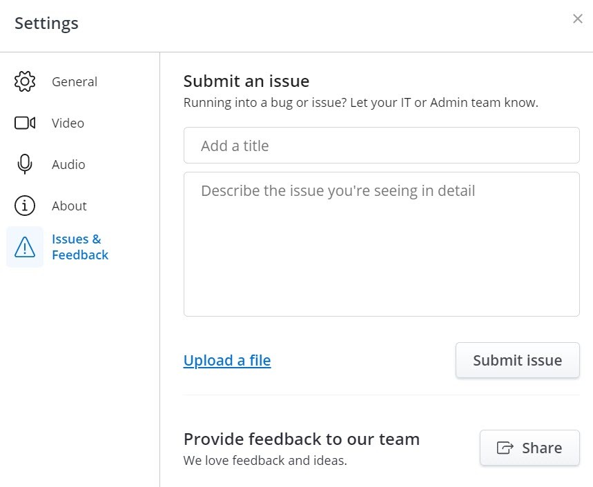 - Im MiTeam Meetings Aufgabenfenster klicken Sie auf Problem melden. Das Fenster Ein Problem senden wird geöffnet.
