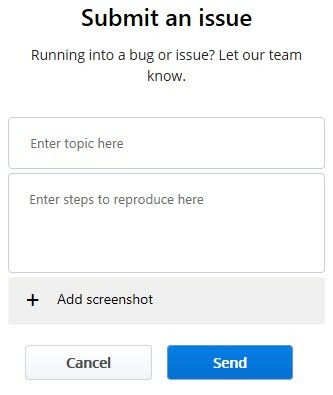 - Geben Sie einen Titel für das Problem ein und geben Sie eine kurze Beschreibung des Problems einschließlich der Schritte zur Darstellung des Problems an. Klicken Sie auf Screenshot hinzufügen, wenn Sie einen Screenshot des Problems anhängen möchten. Klicken Sie auf Senden.