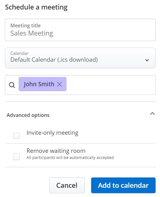 - Standardkalender (.ics download) - lädt eine ICS-Datei mit den Details der Meetingteilnahme, dem Titel und den Teilnehmern herunter, die in Ihrer Standardkalenderanwendung (z.B. Outlook-Desktop) eingesehen werden kann.