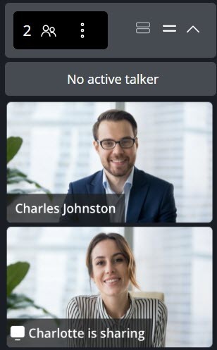 Wenn Sie den freigegebenen Inhalt anzeigen, sehen Sie ein Layout wie den “Aktiver Sprecher“-Modus, in dem der freigegebene Inhalt neben den Benutzerkacheln angezeigt wird. Wenn die Bildschirmfreigabe gestartet wird, werden standardmäßig alle Teilnehmer in der Ansicht der Videokacheln angezeigt. In der Videokacheln-Ansicht wird das Video aller Teilnehmer angezeigt, bei denen das Video aktiviert ist, sowie der Avatar der Teilnehmer, bei denen das Video deaktiviert ist. In der Listen-Ansicht wird nur der Name aller Teilnehmer am Meeting angezeigt.
