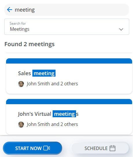 - Geben Sie in der Suchleiste den Namen des gesuchten Benutzers ein. Während Sie die Zeichen eingeben, wird eine Liste der Meetings mit übereinstimmenden Namen angezeigt.