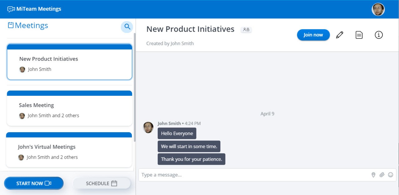 Der Startbildschirm bietet einfachen Zugriff auf alle Funktionen von MiTeam Meetings und ermöglicht Ihnen eine schnelle Verwaltung Ihrer Meetings.