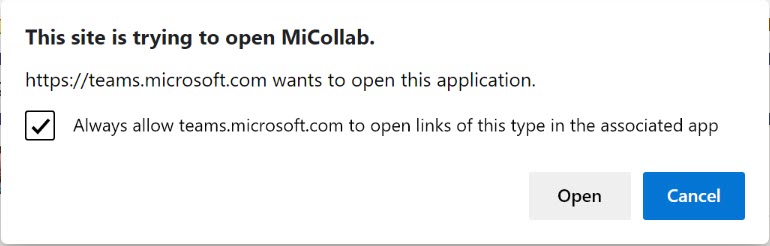 Note: Para asegurarse de que Microsoft Teams siempre pueda abrir enlaces telefónicos desde MiCollab sin solicitar confirmación, seleccione la casilla de verificación Permitir siempre que teams.microsoft.com abra enlaces de este tipo en la aplicación asociada.