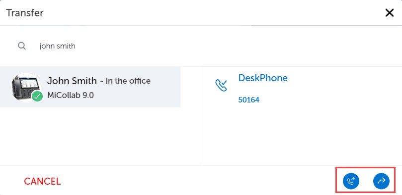 Utilisez la fonction Transfert pour transférer un appel audio MiCollab d’un utilisateur à un autre. MiCollab Client prend en charge deux modes de transfert d’une communication; Transfert supervisé (consultation) et Transfert non supervisé (Aveugle) à partir de la fenêtre d’appel.