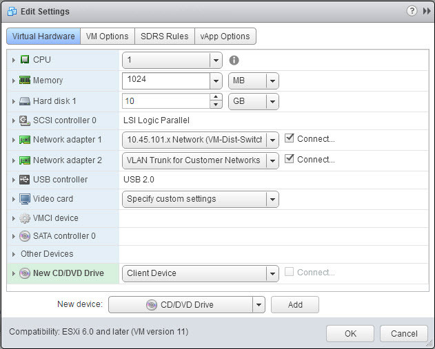 3. From the New device drop-down menu, select CD/DVD Drive and click Add. The new drive appears at the bottom of the Virtual Hardware list.
