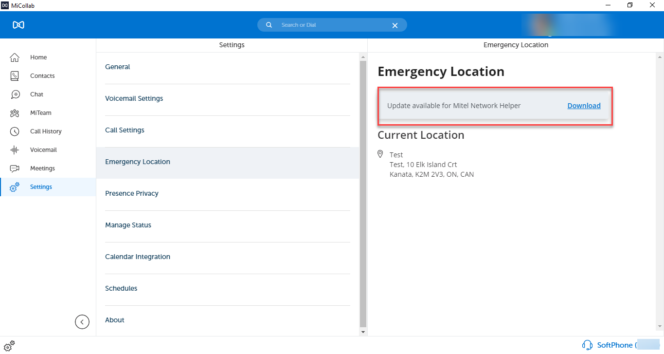 Wenn der Mitel Network Helper auf die nächste Version aktualisiert wird, sehen Sie im Fenster Notfallort die Option zum Aktualisieren der Version von Network Helper. Klicken Sie auf Herunterladen, um die in Ihrem System installierte Version von Mitel Network Helper zu aktualisieren