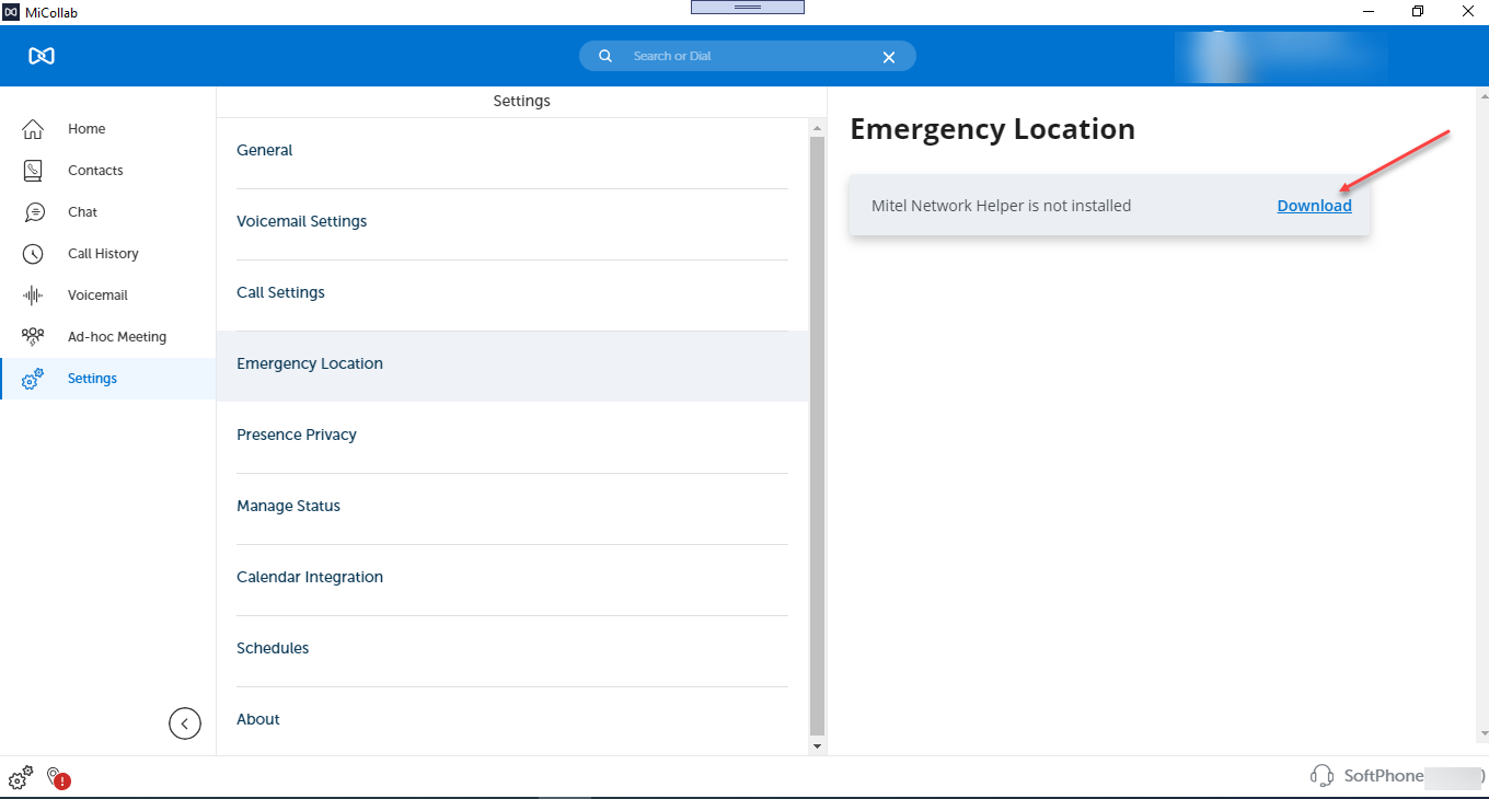 Um den Mitel Network Helper zu installieren, gehen Sie zu >Einstellungen Notfallstandort und klicken Sie auf die Option Herunterladen.
