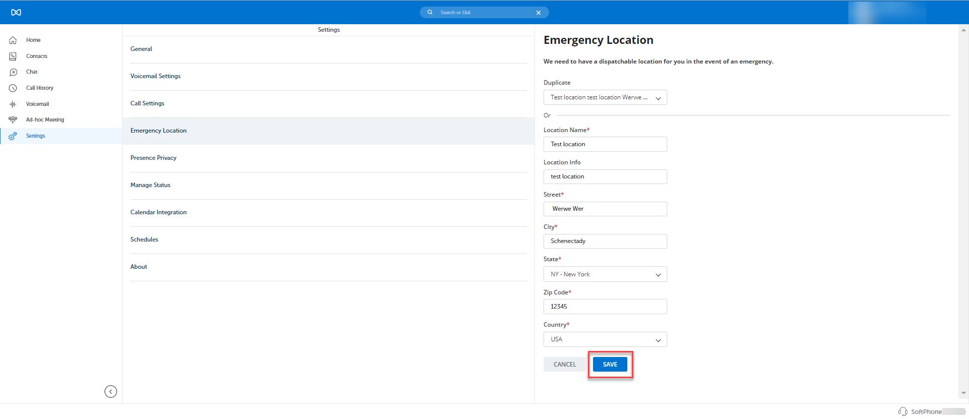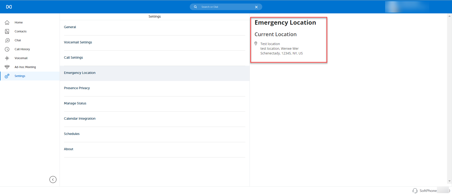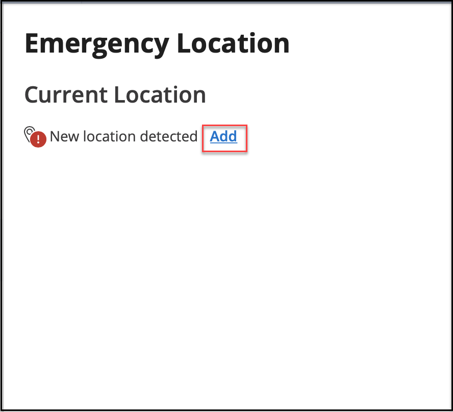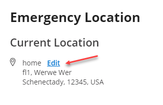 Once the Emergency Location details are saved, the information is displayed under the Emergency Location settings.