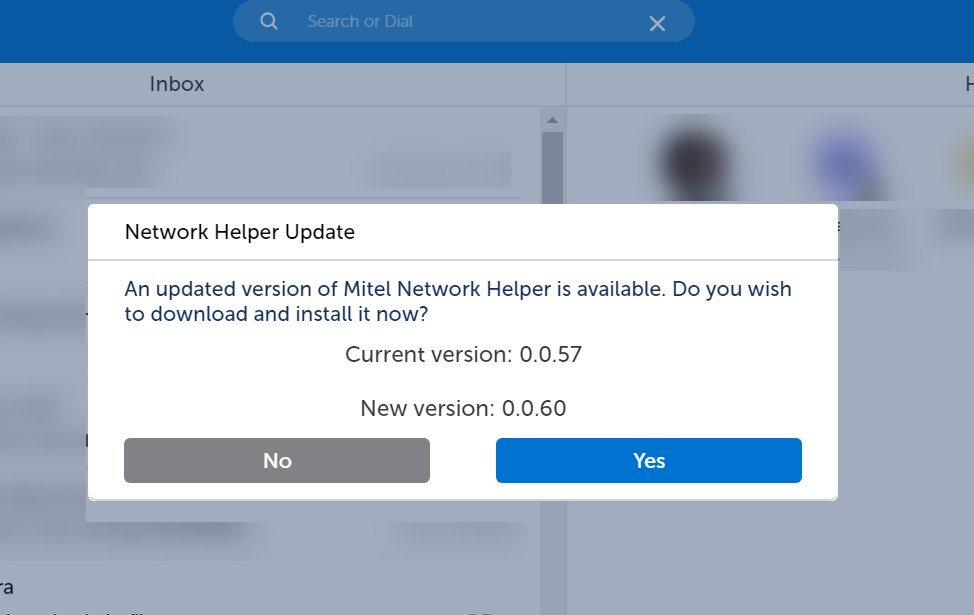 If an update is available for Mitel Network Helper, and the user is logged out and they log in (re-login) back, the user will receive a pop-up notification to upgrade to the latest version. Here, the user either can click Yes to upgrade to the latest Mitel Network Helper or click No to continue with the existing version.