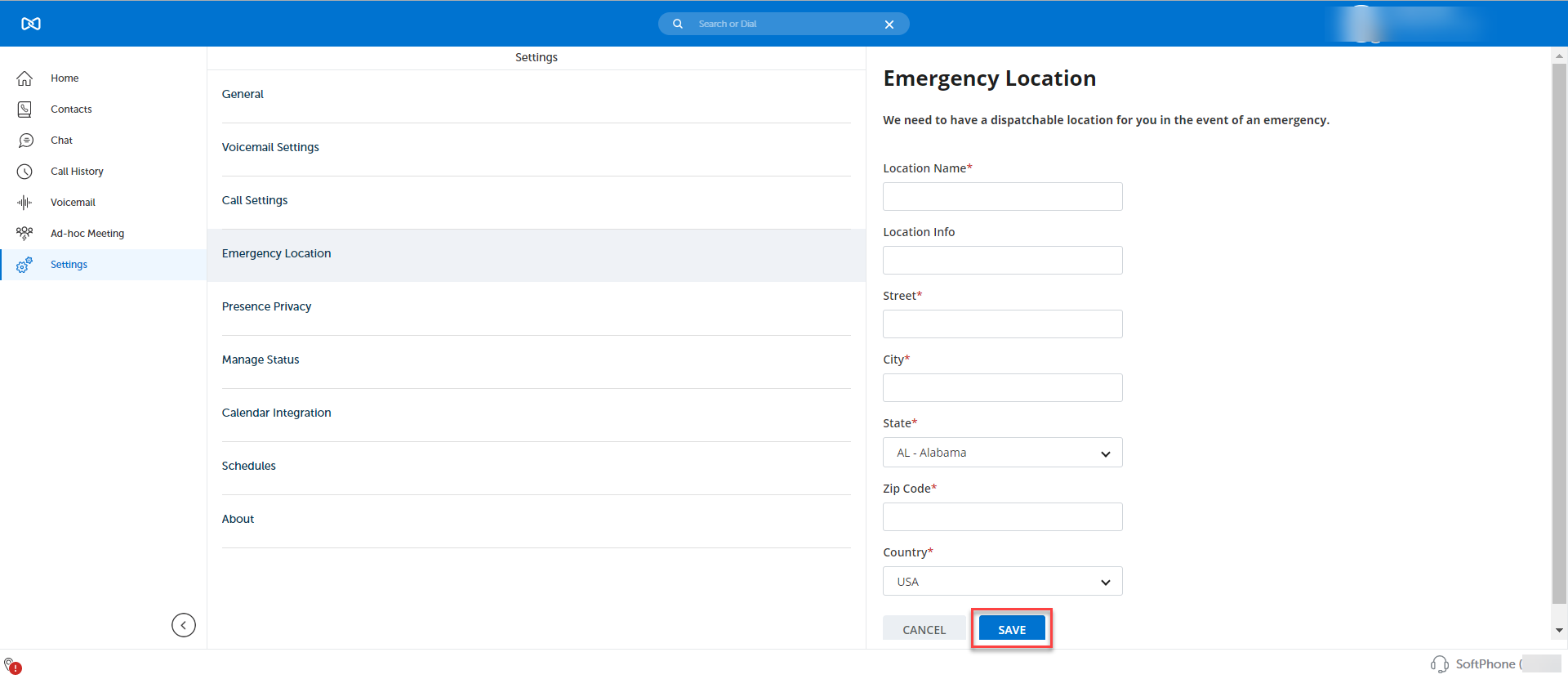 Note:For users who have selected the Intrado service, in the street address field the address should be correctly and appropriately entered. However, depending on the location entered, Intrado may not insist on the street address being fully validated. If the address is accepted, then it is sufficient for proper emergency call routing.