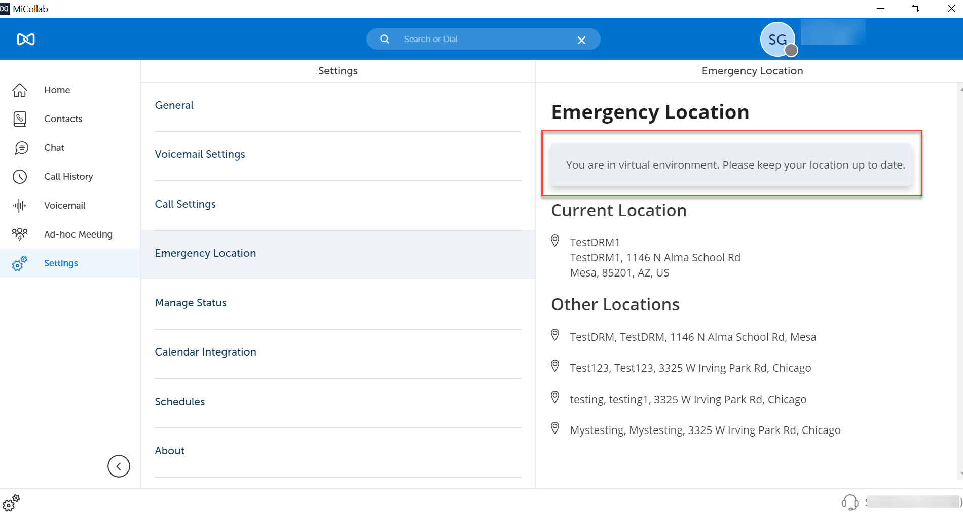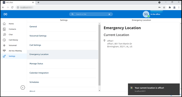 MiCollab client users need to periodically check and ensure that the correct address is displayed under the Emergency Location of the client because the client may not always detect a change in location. This check should be done when you start/restart the client or change the location, to see if the new location change is reflected in the client. Specifically, if the user's network is provided by a 4G/LTE Hotspot, or tethered mobile phone, or other mobile devices, then the client will not detect a change in locations.