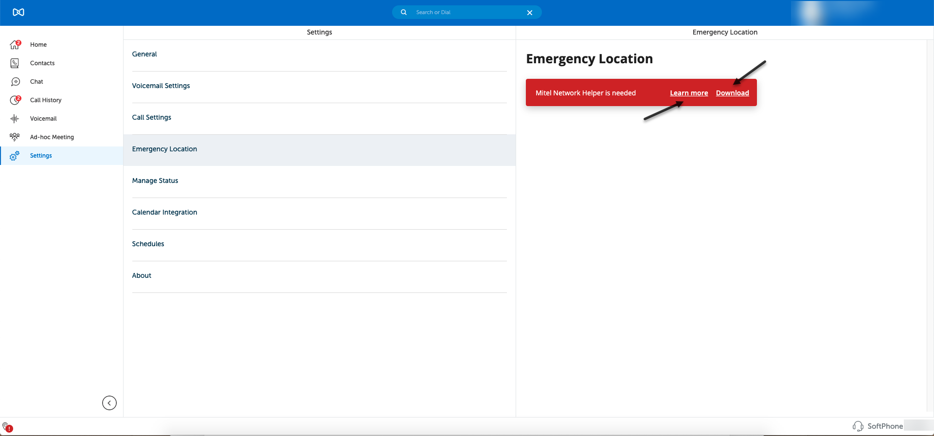 To install the Mitel Network Helper, go to Settings > Emergency Location and click on the Download option.