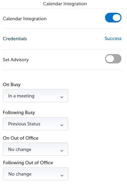 After successful calendar integration, enable Set Advisory to display the advisory message based on your events in the calendar. The following advisory messages are displayed: