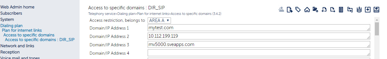 - Navigate to Dialing Plan > Plan for Internet links > Access to specific domains, enter the domain name or IP address under the Domain/IP Address 1 textbox (for example, mytest.com).