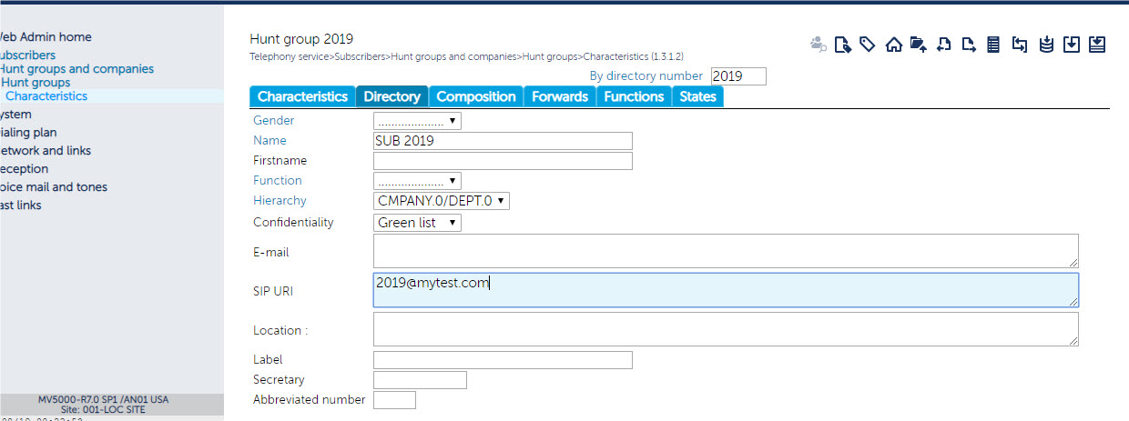 - Open the Hunt group page and enter the SIP URI details AWVHuntGroup@mytest.com) as shown below: