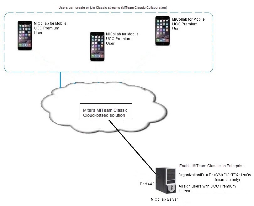 In a peered Enterprise solution, all peered Enterprises must have the same MiTeam Classic OrganizationID in order for all UCC Premium users with active MiTeam Classic license subscriptions to join Classic streams. The following figure shows an example of a peered configuration with MiTeam Classic services: