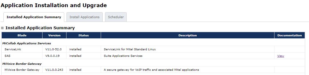 The Installed Application Summary tab lists the MiCollab applications, services and security update blades that are currently installed on the server.