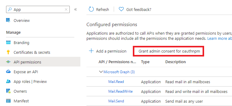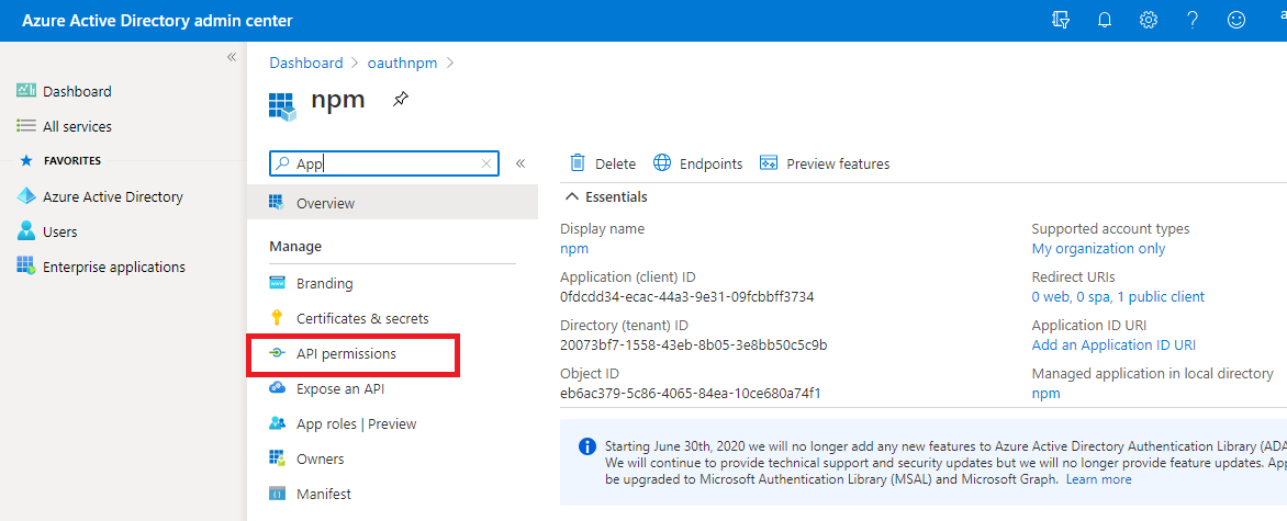 - Select API permissions in the left-hand navigation under Manage.