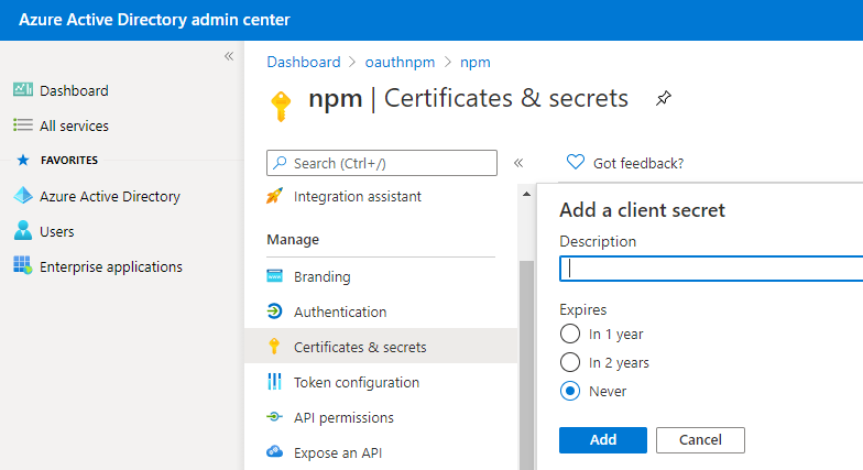 Under Manage, click on Certificates & Secrets from the left-hand navigation pane.