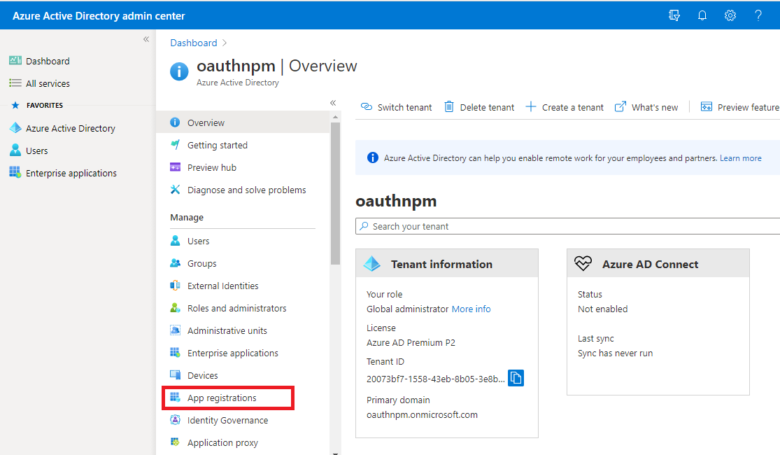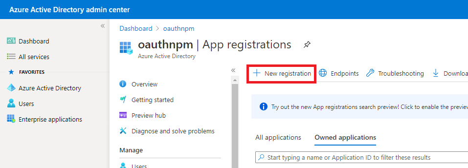 - Select Azure Active Directory in the left-hand navigation, then select App registrations under Manage.