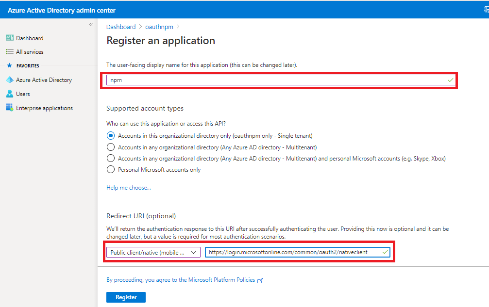 - For Redirect URI, change the dropdown to Public client (mobile & desktop) and set the value to https://login.microsoftonline.com/common/oauth2/nativeclient