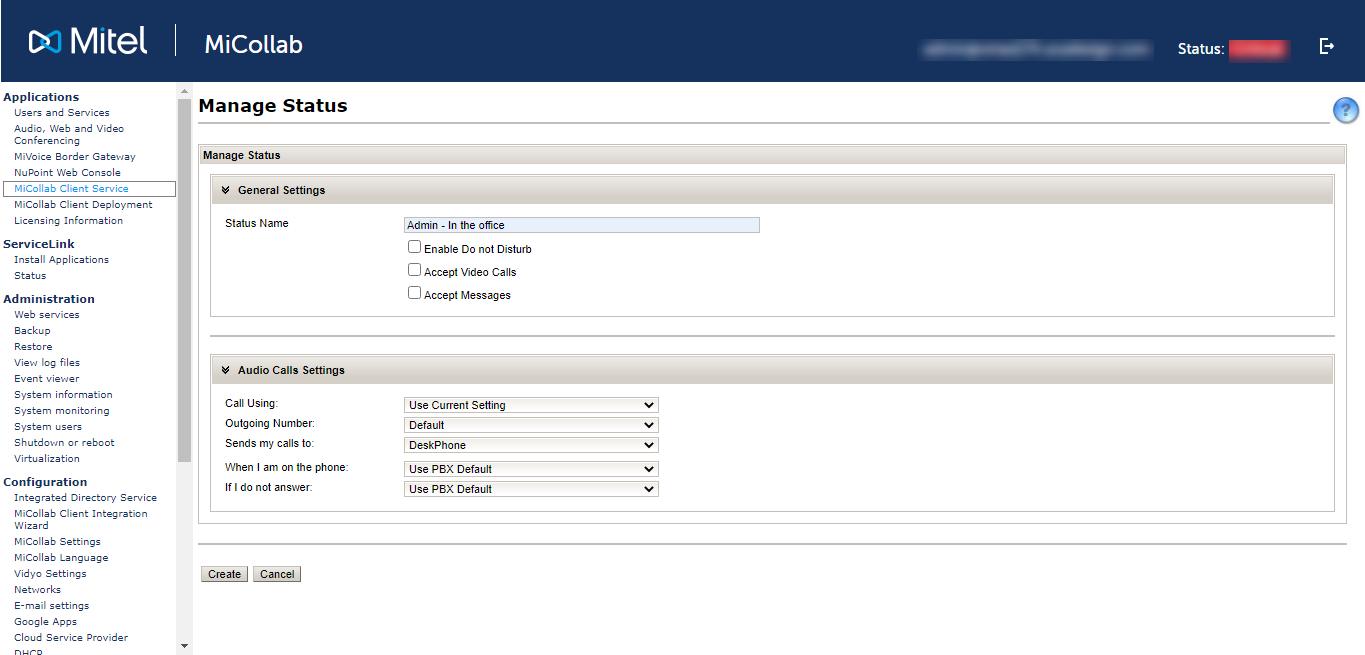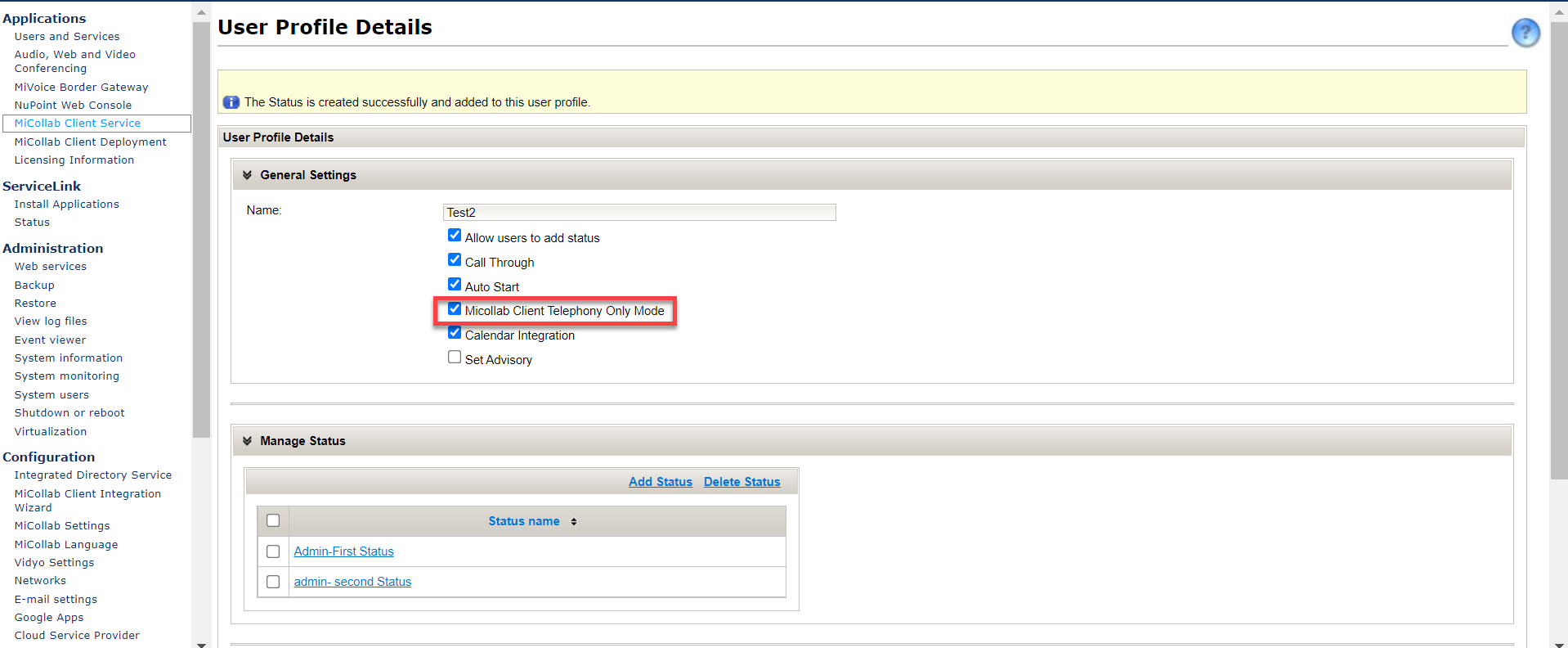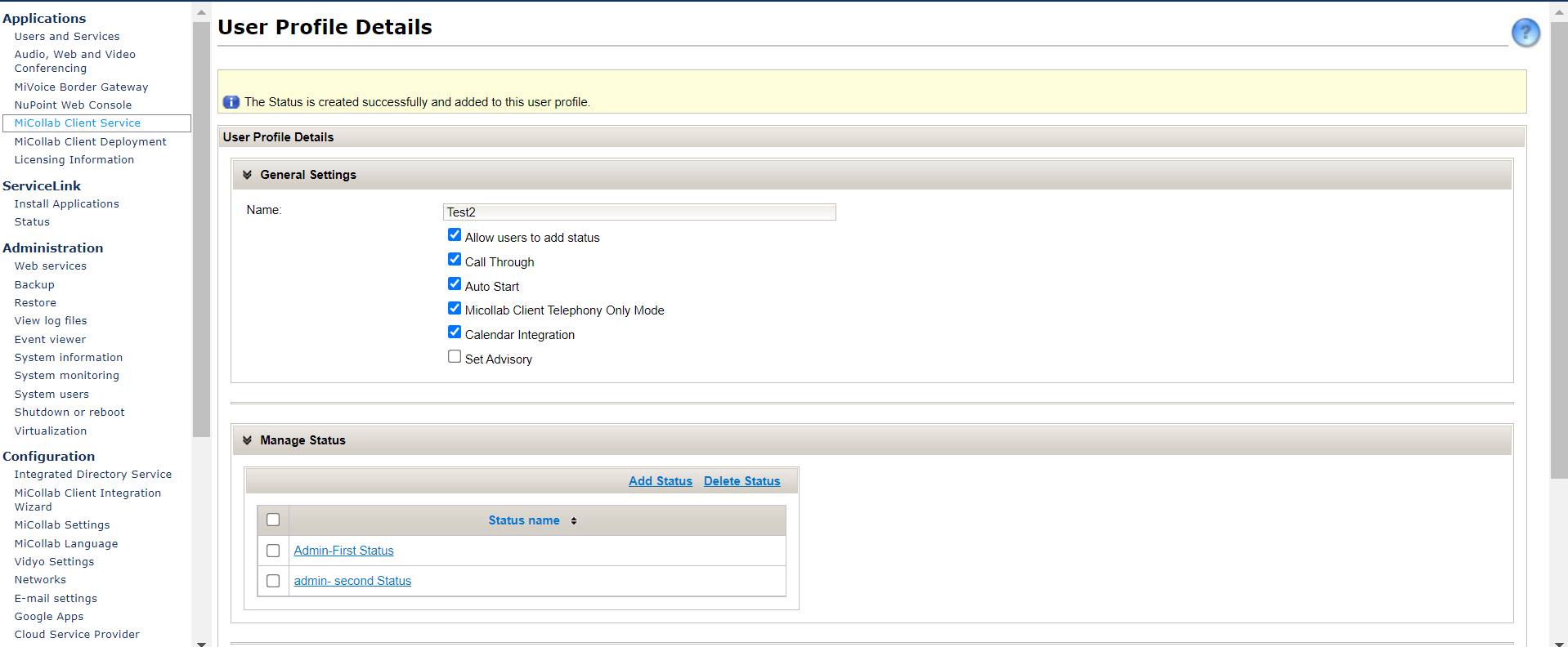 Once the status is created, assign a user profile to the user, and then the same can be viewed under MiCollab client > Settings> Manage Status.
