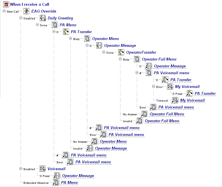 The Alternate Daily Greeting template allows users to set up a call flow when they are using an Extended Absence Greeting (EAG). The caller hears the greeting advising that the user is away and is presented with alternative options.