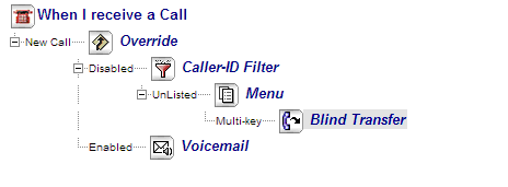 Caller ID: This optional action handles calls based on whether the caller's number is in your Caller ID list. You can delete this action from the call flow without impacting the operation of the NP Receptionist feature.