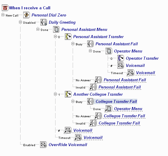 Voicemail: This optional action sends the caller to a NuPoint Unified Messaging mailbox. You can delete this action from the call flow without impacting the operation of the NP Receptionist feature.