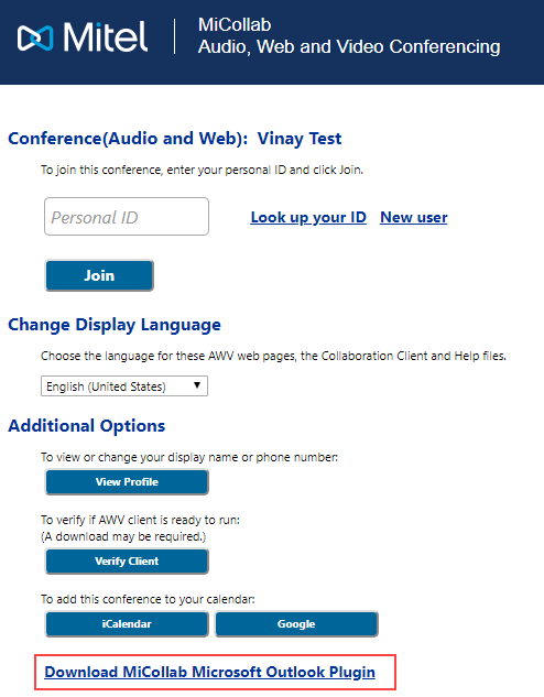 The download link for MiCollab Microsoft Outlook Plugin is available on the MiCollab Audio, Web and Video Conferencing client launcher, the Join Web page, the MiCollab Audio, Web and Video end user portal, and the welcome e-mail.