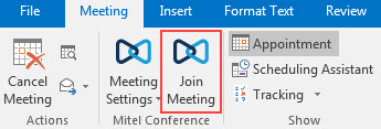 Click the Join Meeting button in the Mitel Conference ribbon to join the meeting as a leader or as a participant in MiCollab Audio, Web, and Video Conferencing Web Client.