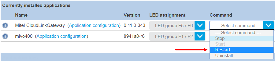 Als u een SMBC-platform met ingebouwde gateway heeft en er zijn downloadfouten, kan een beheerder de opdracht Herstarten toepassen op de Mitel-CloudLink Gateway in het scherm Software > Applicaties van de SMB Controller Manager-beheerconsole, zoals hieronder wordt weergegeven.