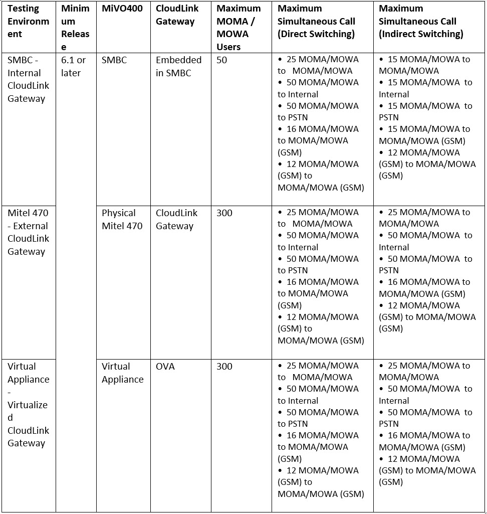 De volgende tabel geeft een overzicht van het maximale aantal MOMA/MOWA-gebruikers dat wordt ondersteund op de MiVoice 400 PBX.