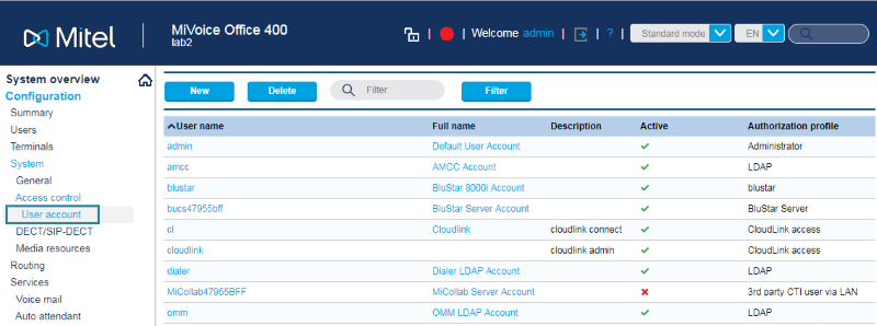 Voor licentiedoeleinden moet een admin-gebruiker worden toegevoegd aan de MiVoice Office 400 PBX om CloudLink-applicatie-inloggegevens te creëren, waarmee de CloudLink Gateway wordt ingesteld als een vertrouwde applicatie.