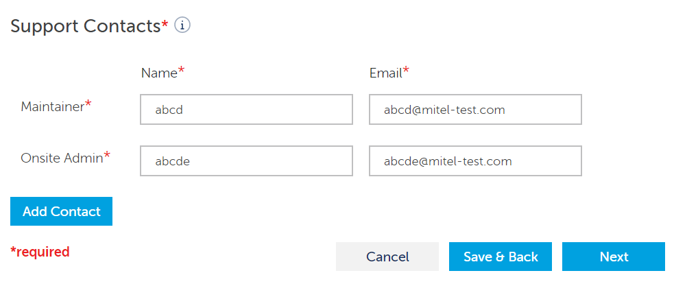 Wanneer een klant een probleem meldt met een CloudLink application, wordt een e-mail verzonden naar de ondersteuningscontacten. De ondersteuningscontacten zijn verantwoordelijk voor het aanpakken van de problemen die door hun klanten zijn gemeld en nemen indien nodig contact op met de Technische ondersteuning van Mitel Partner via de juiste kanalen. Om een ondersteuningscontact toe te voegen, voert u de naam en het e-mailadres van de beheerder, de onsite beheerder of een andere gebruiker in, zoals weergegeven in de volgende afbeelding.