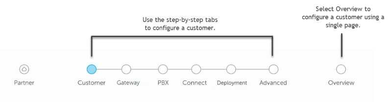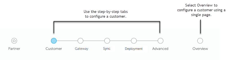 U kunt een klant stapsgewijs toevoegen door op koppelingen in de navigatiebalk te klikken of u kunt alle stappen vanaf één pagina uitvoeren door de optie Overzicht te selecteren. Sommige van de onboarding-stappen zijn verschillend voor de twee ondersteunde platformtypen die hieronder worden vermeld: