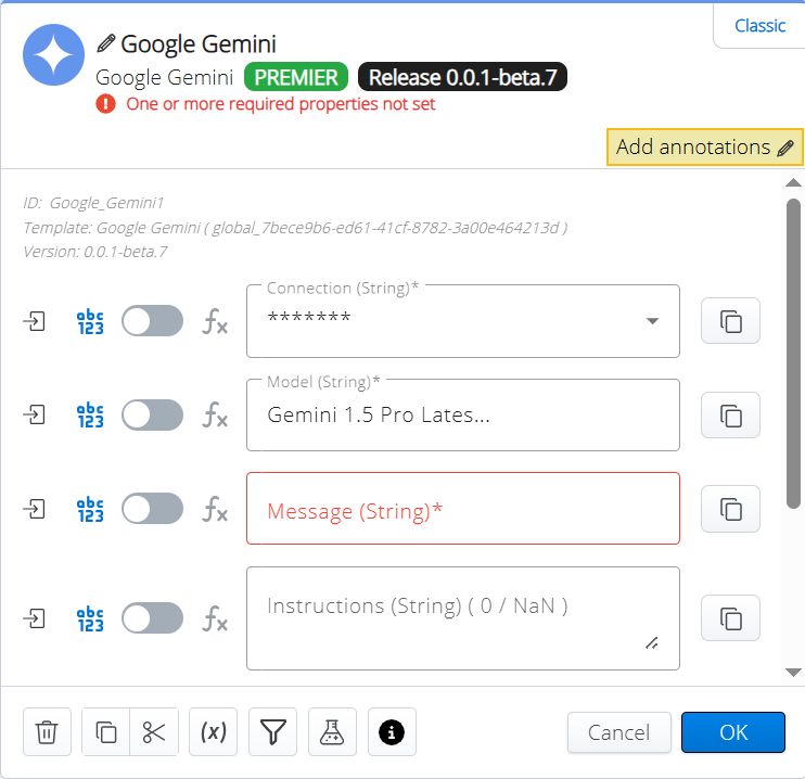 7. In the Google Gemini activity screen, provide the configuration options as described in the Google Gemini - Field description table.