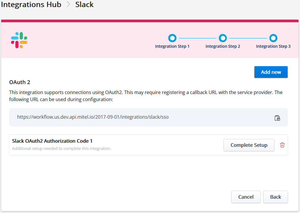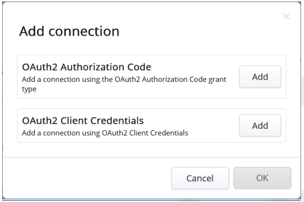 - Click Add next to the connection type you want to use for the integration.Note: The connection type will vary depending on the Integrations. Refer to the Integrations chapter to know the applicable connection type for each integration.